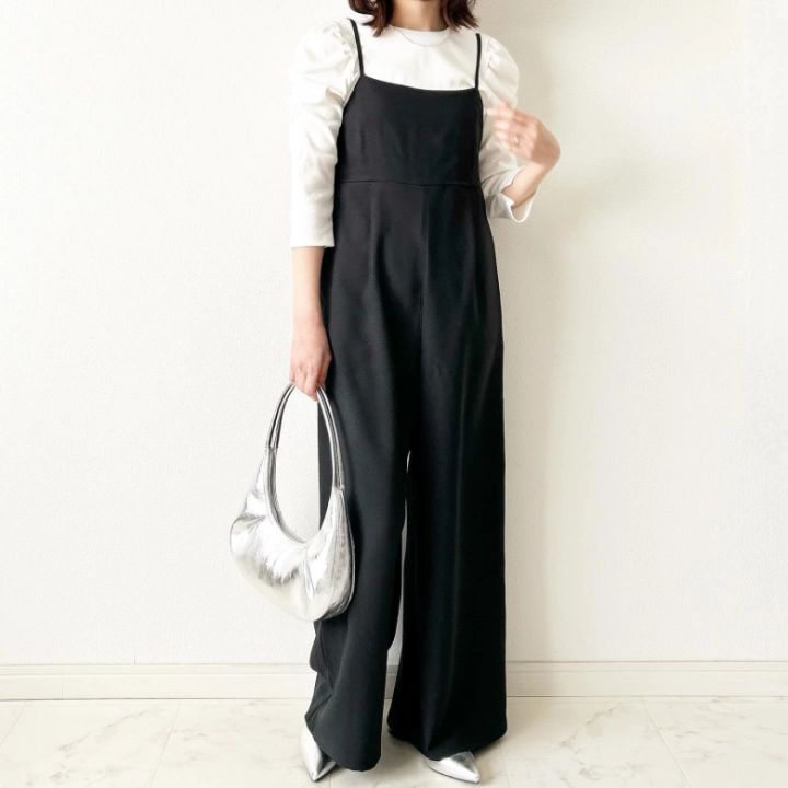 レイヤード次第でいろいろなおしゃれが楽しめるのが、キャミソールジャンプスーツの大きな魅力。シンプルなホワイトトップスなら、大人の余裕を感じられるような品格コーデが叶います。シルバー小物を合わせれば、プチプラアイテムとは思えないスタイリングに!