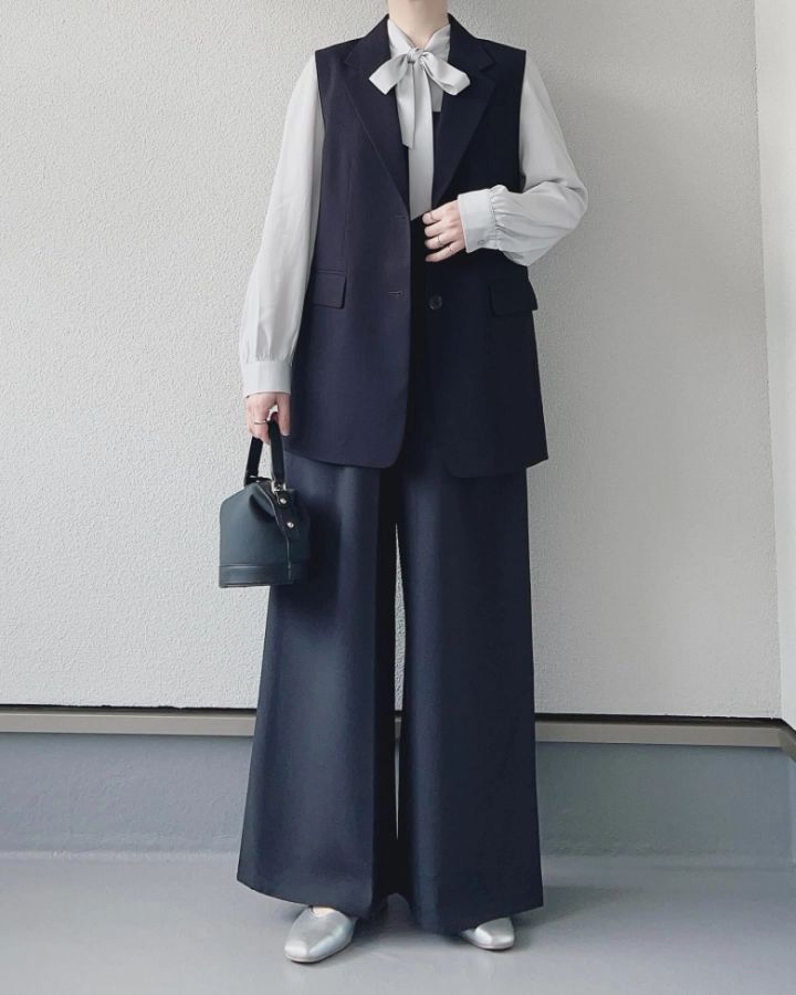 GUの「オーバーサイズテーラードベスト」3,990円(税込)を合わせれば、おしゃれなセットアップ風コーデが完成します。リボンつきのトップスを合わせることで、エレガントな印象に。きちんと感のあるコーデで、ちょっぴり特別な日にもおすすめの着こなしです。