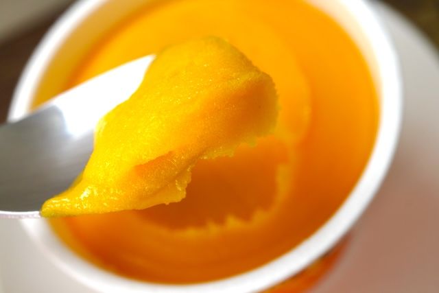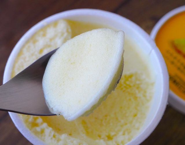 一口食べてみると、これはもうマンゴーそのもの! 濃厚なマンゴーの甘さもさることながらねっとりとした食感も加わってかなり本物に近い味わいです。つめたく冷やしたマンゴーを食べているみたい。これはマンゴー好きな人にも満足してもらえること間違いなし!