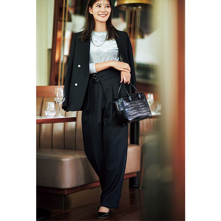 ウエストのベルトデザインが効いたゆるパンツに、かっちりジャケットでほんのりモードに。ジャケットとパンツはチノ、バッグはメゾン カナウ。