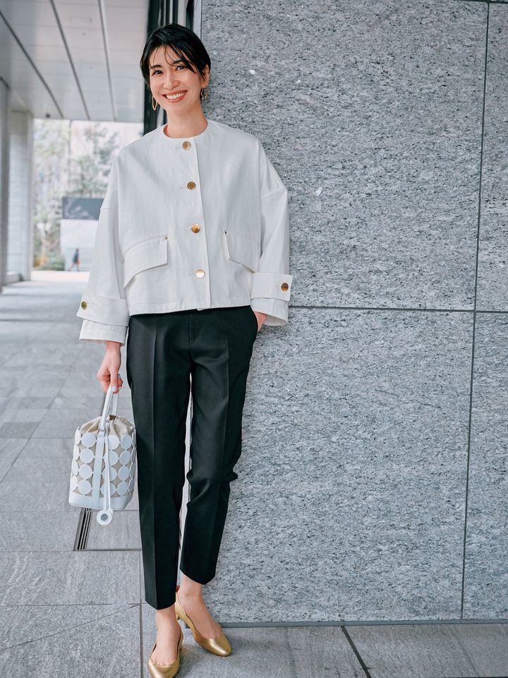 クールなモノトーン柄も、ノーカラーとバルーン袖で優しげに。ボトムスを選ばない丈が使いやすそう。ジャケット、ブラウス、バッグ、靴はすべてミラ オーウェン。