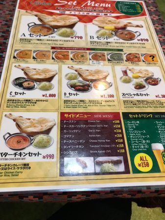 A~D・スペシャルセット・バターチキンセットの6種類から選ぶことができます。カレーは8種類から選ぶことができ、ごはんとナンは無料でおかわりできます。お子様セットもありました。