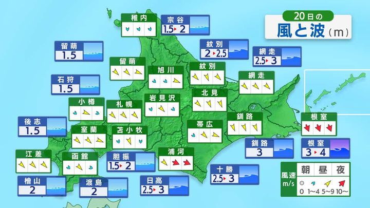 20日(土)は広く雲に覆われ、オホーツク海側は冷たい雨が降るでしょう。釧路、根室地方も朝は雨が降りやすく、日中いっぱい風の強い状態が続きそうです。車のハンドルが取られないように注意してください。