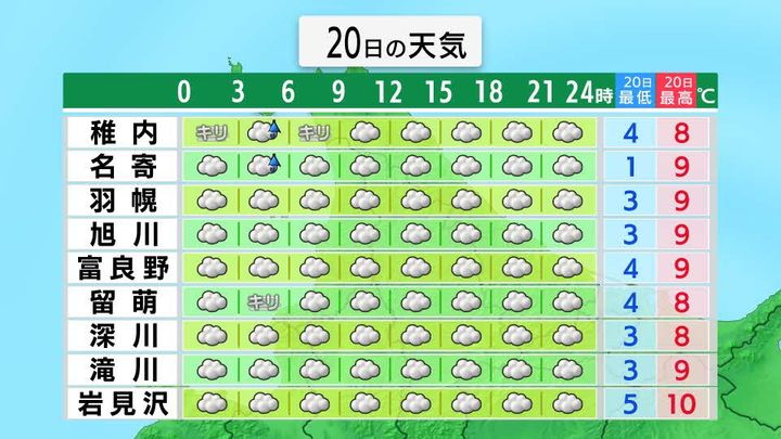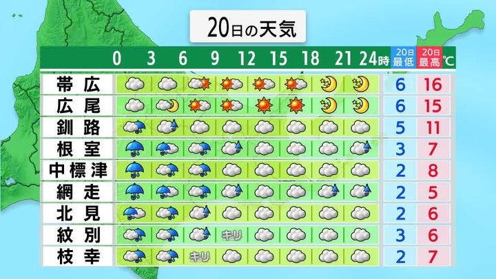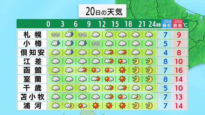 20日(土)朝の最低気温は、道南や札幌で7度くらいのほかは、広く4度前後で、北見、網走は2度の見込みです。日中の最高気温は、函館や帯広で16度、そのほかは10度前後で、網走は5度にとどまるでしょう。