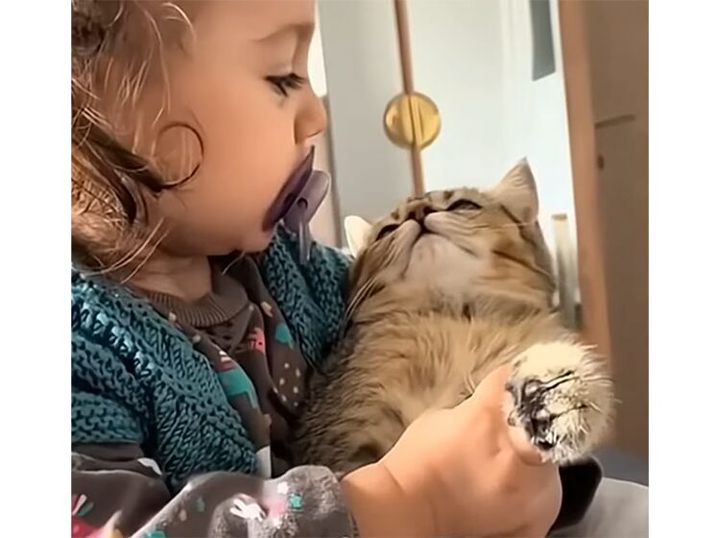 3. 赤ちゃん抱っこされている猫、愛されすぎてちょっぴり困惑。