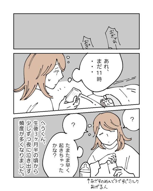 特に産後3ヶ月くらいまでが体力面で辛かったと振り返るマキノさん。へうくんが生後3、4ヶ月になると少しの間ならおもちゃで遊べるようになったり理由の分からない泣きも減り、ほんの少し心のゆとりが出てきました。生活リズムがついてきて、ワンオペでのおでかけやお風呂などもルーティン化され効率よくできるようになってきたのですが・・・そんな頃、恐れていた「アレ」が始まるのです・・・。