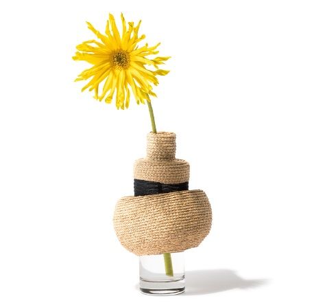 ラフィア椰子とシースルーの素材で、グラスをドレスアップ。スカートに見える部分をつまんで持ち上げると、動きのあるフォルムに。花を生けてもよし、そのまま飾ってもよし。W11.5×H21cm¥11,000(MOBJE/藤井製帽 TEL:0848・48・3311)