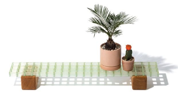 オークの角材に、樹脂とガラス繊維から作られた強化プラスチックのプレートを乗せて使うプラントボード。鉢下の通気性が確保できるので水をあげた後も安心。W80×D15.5×H11cm¥33,000(Magical Furniture)