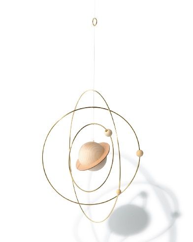惑星の自転と衛星が周回する様をモチーフにしたプラネットモビール。衛星と惑星は白檀、惑星の輪はヌメ革、3つの輪は真鍮を使い、経年による色合いの変化も楽しめる。W30×D8×H30cm¥28,600(i ro se×tegoto/i ro se TEL:03・6659・4046)