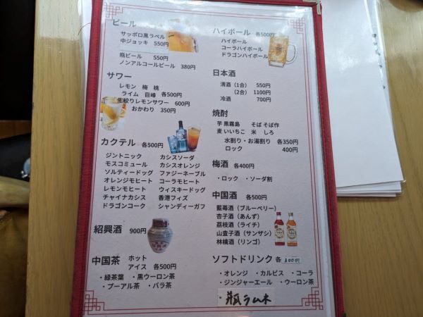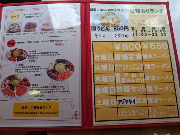 こちらがメニュー表です。九州の中華料理店らしく、ちゃんぽんや皿うどん、他にも麺類ご飯ものや一品料理など、メニューが豊富です。