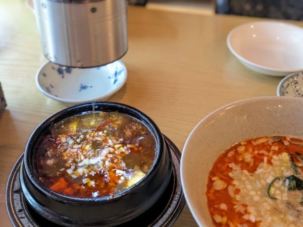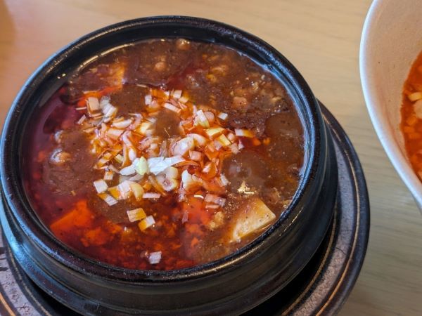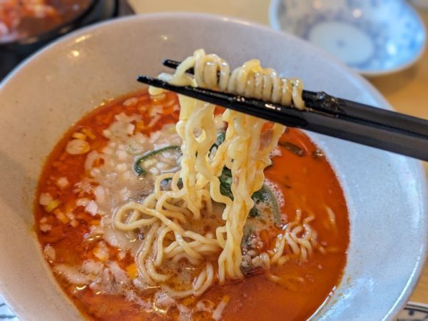 見た目より辛くなく、辛さよりも濃厚なゴマがリッチでクリーミーなスープです。麺も中太のモッチモチで、たまらないおいしさでした。
