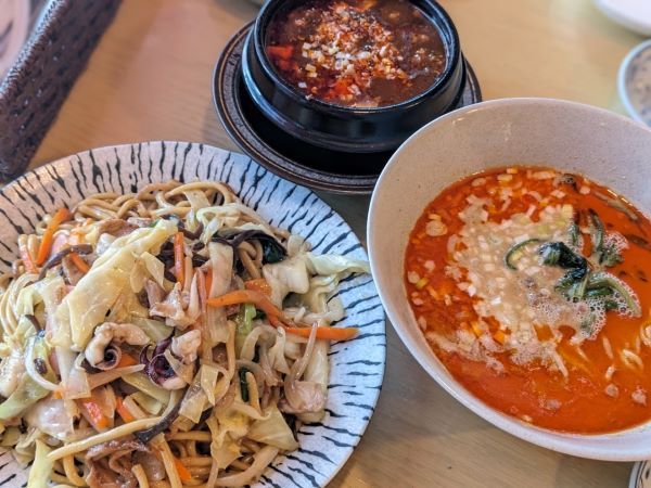 食べてみた瞬間、初の食感と味に感動!モチモチで麺の内部にまでしっかりと味がしみ込んでいます。太麵皿うどん(ちゃんぽん麺)が好きで幾度となく食べてきましたが、どうしてこんなにおいしのか伺ってみると、「麺を一度焼いた後に煮るという作業を行う手間を掛けている」とのこと。ただ焼いただけでは味は染みないですし、いきなり煮たのでは麺の弾力が失われるのでしょうが、このひと手間で、こんなにも絶品に仕上がっているです。 担々麺は見るからに本格的です。