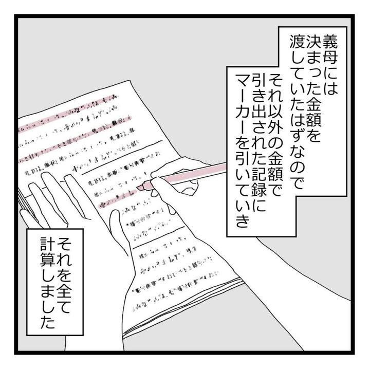 義母に渡されていない分の金額を計算していた夫でしたが、電卓を見つめる表情は青ざめています。果たしてその総額はいくらなのでしょう。4年間も期間があったと考えると、決して少しの額ではないだろうと想像できます。