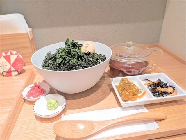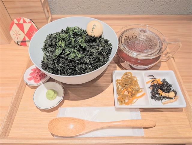 山本山おすすめの「山本山海苔だく茶漬け」。その名の通り海苔がお椀いっぱいに盛られています。付け合わせの小鉢に、味を変えたいときのためのわさびと梅もついています。