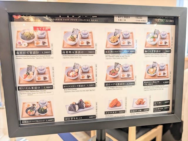 営業時間は7時~23時(ラストオーダー22時)まで。お茶漬けは8時からの提供になります。