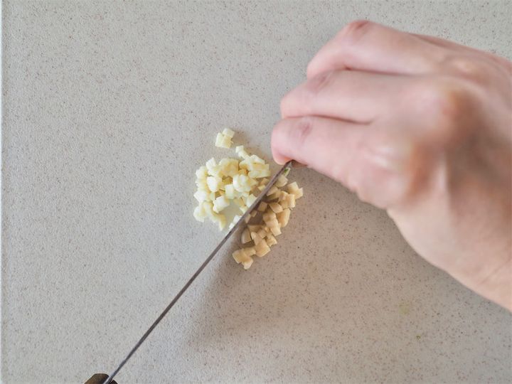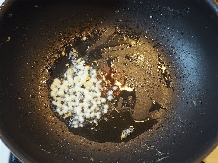 6.5のフライパンをコンロに戻し、3のにんにくを入れ、油に味を移していく。