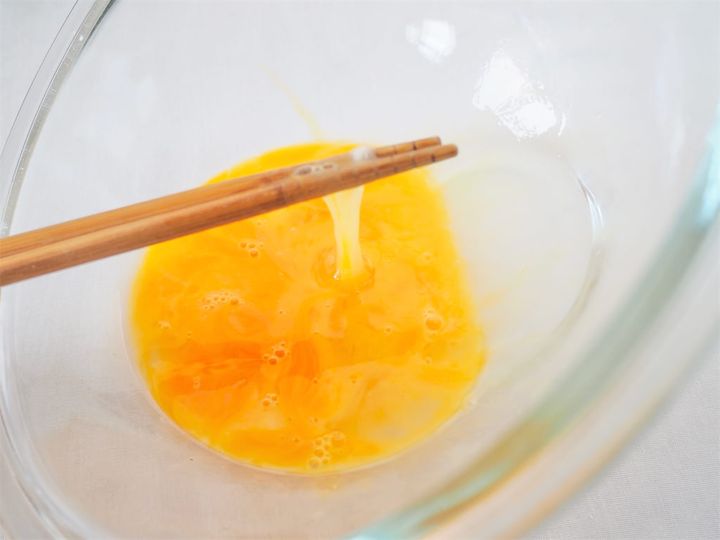 4.卵をボウルに割り入れ、箸で白身を切るように割りほぐしておく。
