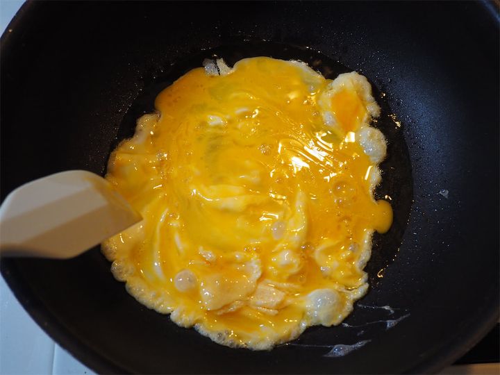 5.フライパンにサラダ油とゴマ油を入れ強火で熱し、温まったら卵を入れる。手早くかき混ぜてふわふわと膨らんできたら、コンロからはなす。油を残して卵を取り出す。