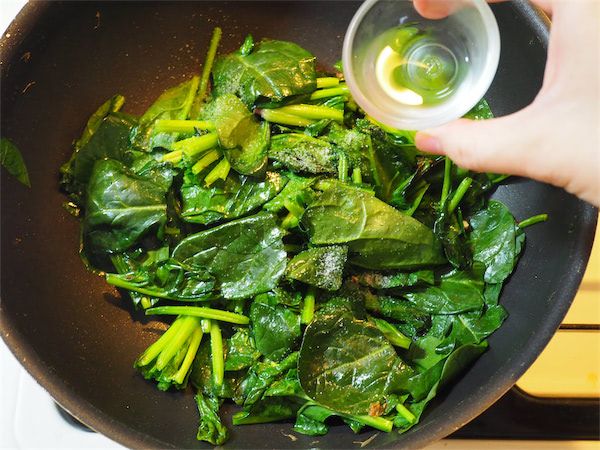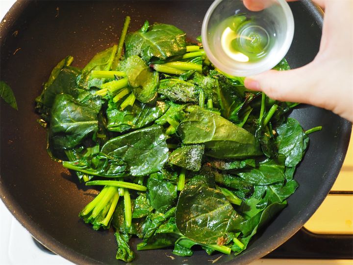 8.ほうれん草の全体に油が回って、半分くらいしんなりしたら塩、水大さじ1(分量外)を加え、さらに炒める。