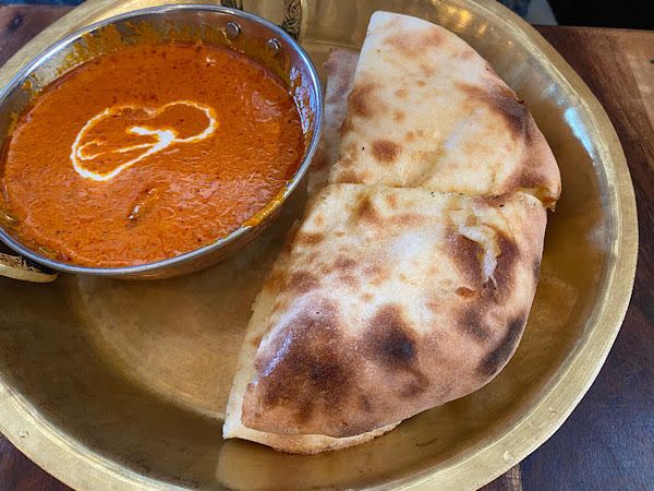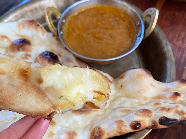 こちらはナンをチーズナンに変更してみました。(追加料金200円) ナンはアツアツとろとろのチーズが惜しげもなくみっちりと詰まっていて、ずっと食べ続けていたい美味しさでした。カレーは一般的なバターチキンカレーよりもスパイスの香りが強く、ナンが進むこと進むこと!