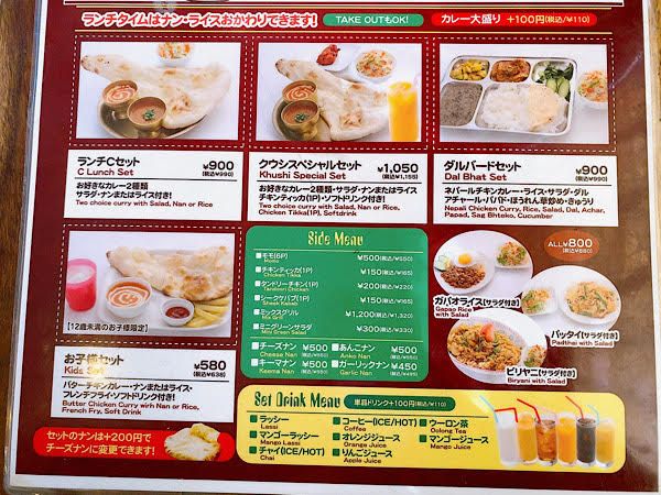カレーのセットがずらり!お子様メニューも用意されていました^^ カレーの他にもガパオライス、パッタイ、ビリヤニといった麺やご飯のメニューも揃っています。