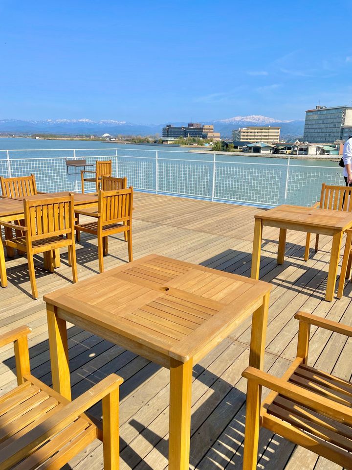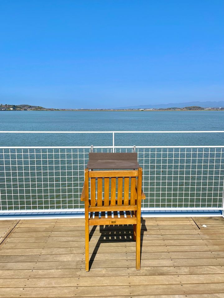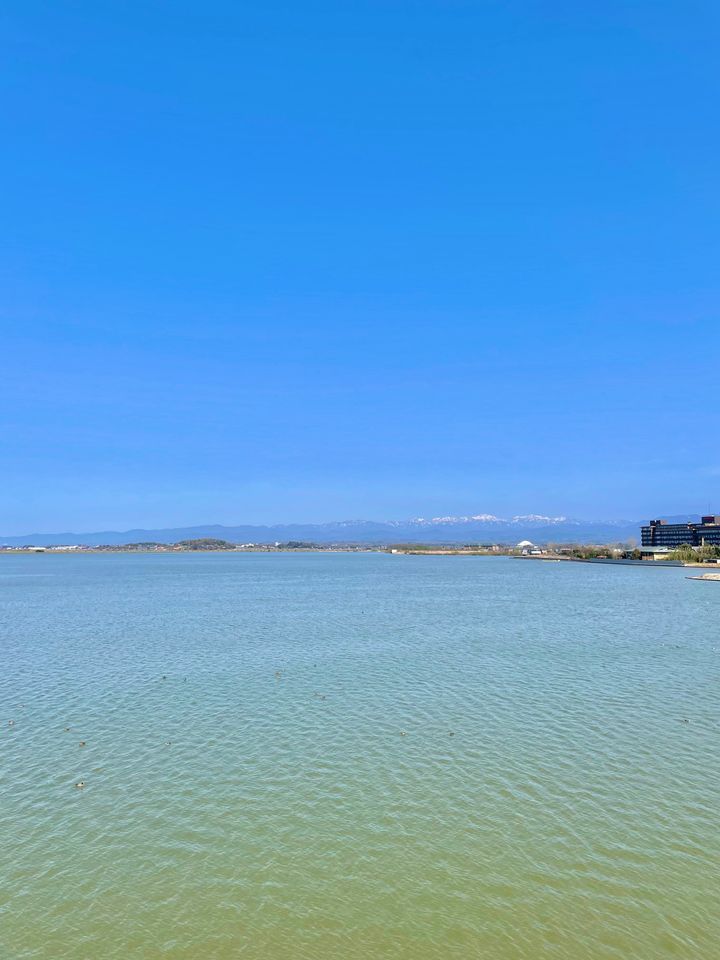 前面に広がる柴山潟の水面と浴槽の水が連続していて