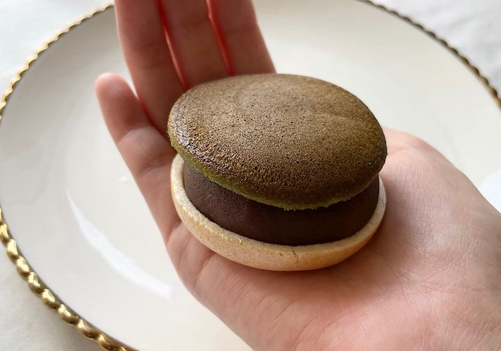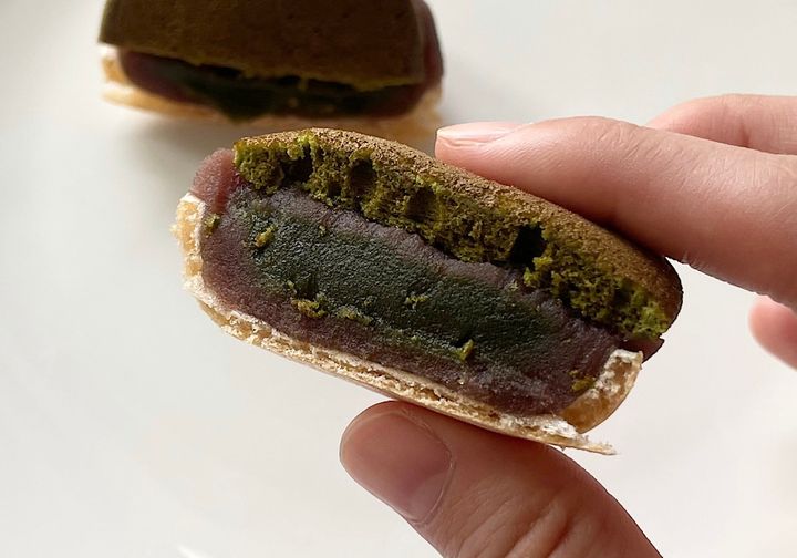 まず紹介するのは、今年の4月に新発売された「もなどら 抹茶」。最中とどら焼きを一度に楽しめる和スイーツです。新発売の抹茶味は、宇治抹茶を使用した抹茶入りのこしあんが使われているのだそう。