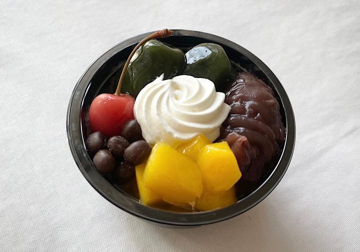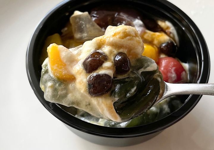 最後に紹介するのは「宇治抹茶くず玉クリームあんみつ」。『シャトレーゼ』で大人気のクリームあんみつの期間限定の宇治抹茶バージョンです。さくらんぼのシロップ漬け、マンゴーのシロップ漬け、ホイップクリーム、寒天、自家炊きつぶあん、塩豆を組み合わせたあんみつに、季節限定で宇治抹茶を使用した抹茶あんをくず餅生地で包餡したくず玉が入っているのだそう。