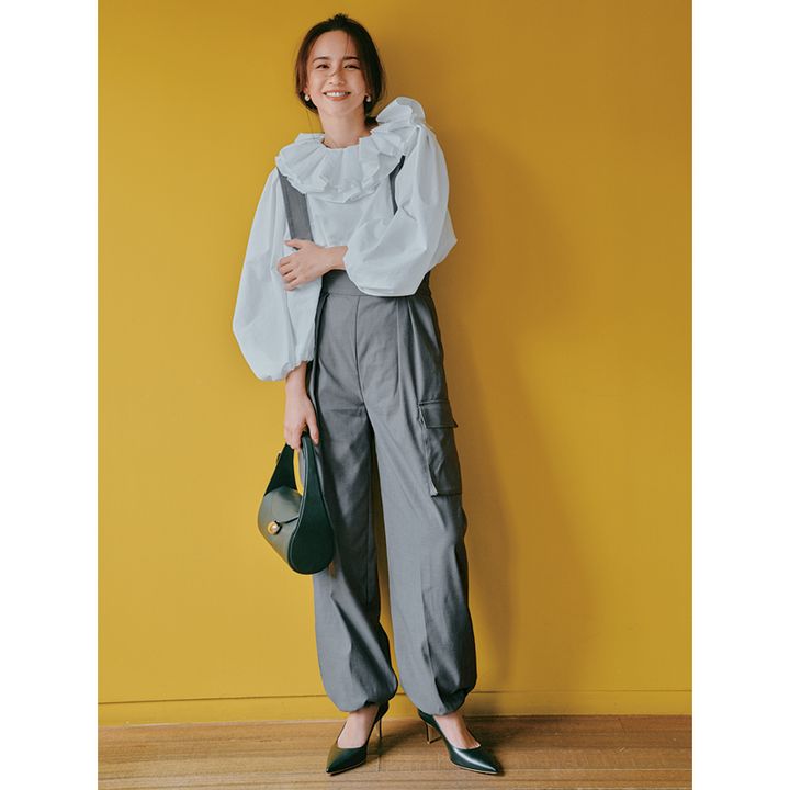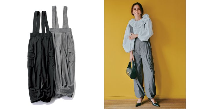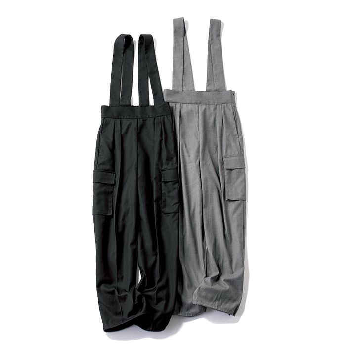 フロントに施された2タックとセンタープレスで、脚をまっすぐ見せてくれます。やや太めのサスペンダーは、全体の縦ラインを強調する役割も。スラックス素材のカーゴパンツだから、ブラウスやパンプスと合わせてキレイめコーデにも。