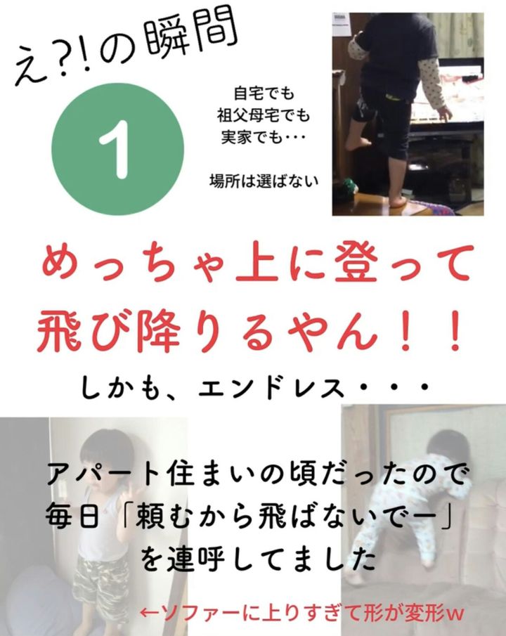 とにかくどこでも高い所に登っては飛び降りるの繰り返し。テーブル、タンス、椅子、ソファ等、毎日毎日繰り広げられます。