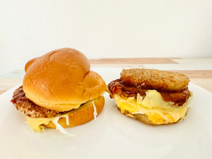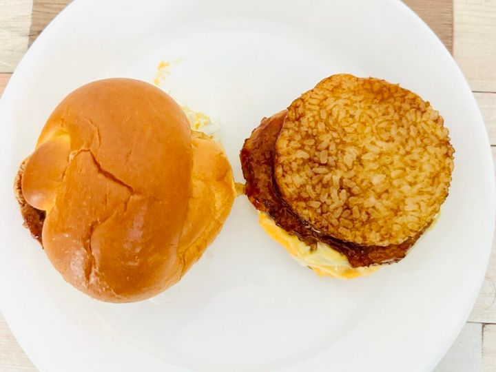パンのほうはボックスに入りでふんわりとしており、トータル的なボリュームはパンの方が大きく見えます。ごはんのほうは紙に包まれていたためか、公式のメニュー画像よりも見た目がかなりコンパクトな印象です。