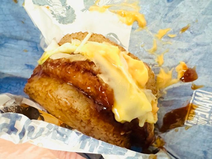 平たい焼きおにぎりのような特製のごはんバンズは、新潟県産のコシヒカリを100%使っているそう。実際に包み紙を開けると、ソースとチーズがあふれんばかりに入っていました。
