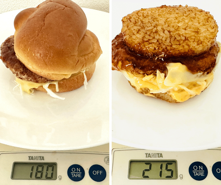 持ったときの重量感はごはんのほうがややずっしりしています。公式発表のカロリーは「油淋鶏チーズ チキンタツタ」は456kcal、「ごはんチキンタツタ 油淋鶏チーズ」は474kcalとのことです。