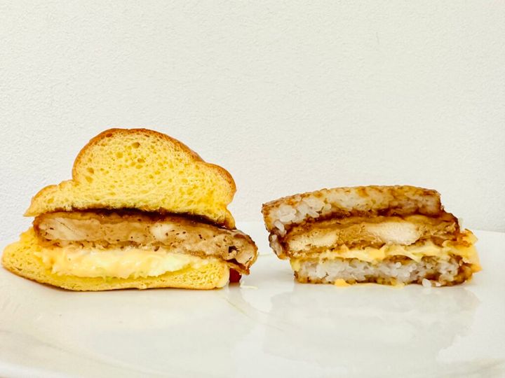 断面はパンがとてもふっくらしているのが分かります。柔らかいので口当たりも軽くぺろりといけちゃうかも。ごはんのほうはおにぎり感が強くて、おなかにも満たされる感じがしました。