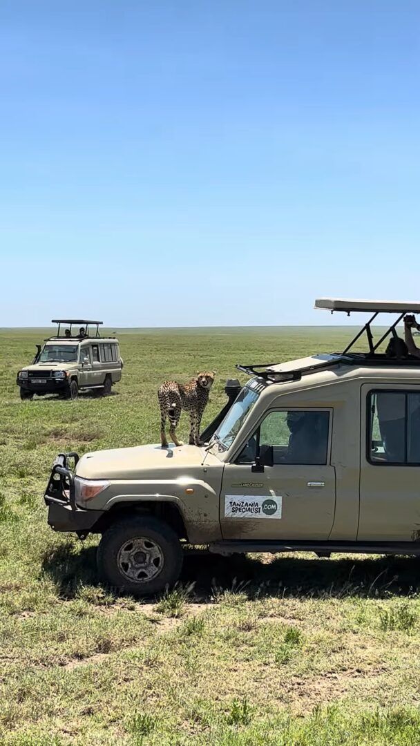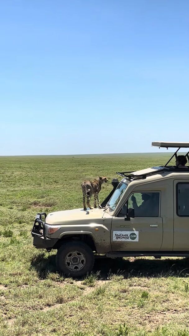 撮影者さんの目の前には、サファリツアー中の車が停まっています。 そのボンネットには、なんとチーターの姿が!! 車が気になってやってきたのでしょうか。