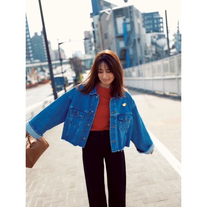 一枚だと少し勇気のいる甘ブラウスも、デニムジャケットを重ねることでほどよいカジュアルコーデに。デニムジャケットはハイク、ブラウスはユナイテッドアローズ、パンツはエブール、ジャケットはカオス。