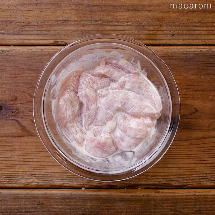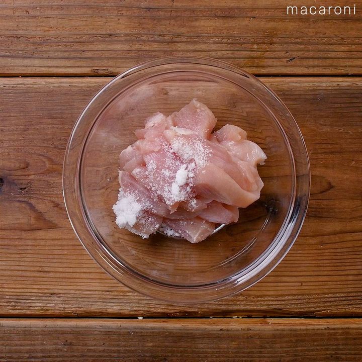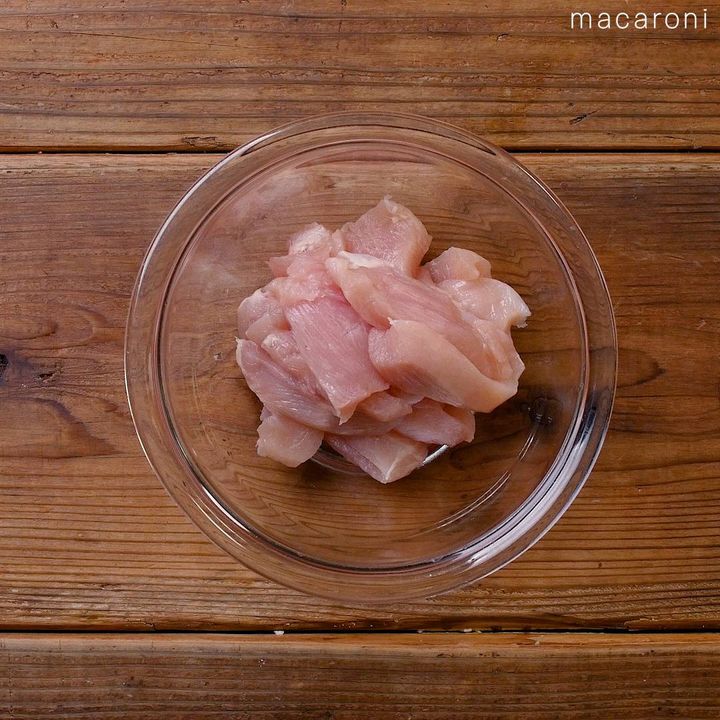 1: 鶏むね肉はスティック状に切り、ボウルにうつします。