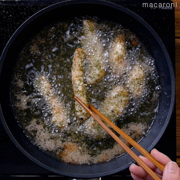 5: フライパンにサラダ油を深さ1〜2cmほど入れて、④を火が通るまで揚げ焼きします。取り出して油を切ったら、器に盛って完成です。