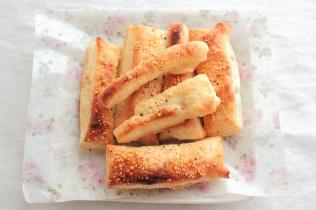 余ったパイシートで作った、ひと口パイです。バターの甘さが広がるサクサクパイに粉チーズの風味がほんのり。軽い味わいと食感がクセになるおいしいおやつに大変身しました。