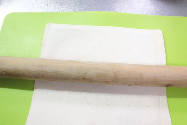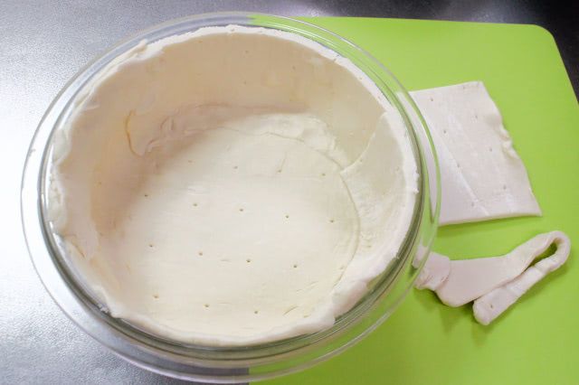 冷凍パイシートをそのまま敷くと膨れそうだったので麺棒で軽く伸ばしておきました。今回は最初から穴が開いたパイシートを使いましたが、穴が開いていない場合はフォークで適当に穴を開けておいてくださいね。