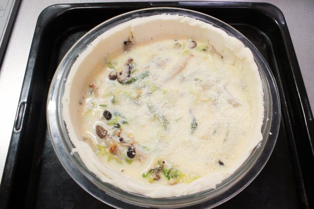 パイシートの上に粉チーズを振り、炒めた具材を入れて卵液をすべて流し込みます。最後に、残りの粉チーズを表面に振りかけました。