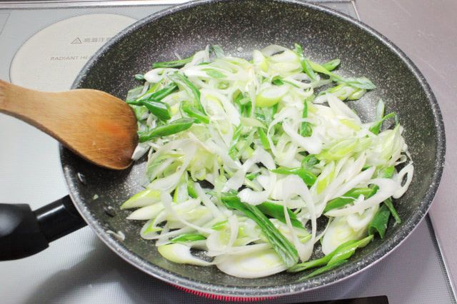 弱火でじっくり炒めて甘味を引き出します。6分ほど炒めると、長ねぎがくったりと炒まりました。