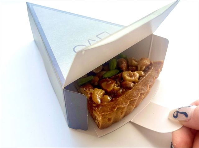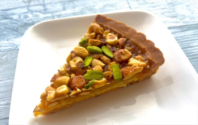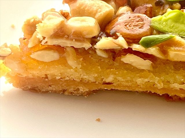 上にのっているナッツはザクザク、キャラメルはねっとり、下の生地はサクサクしていてさまざまな食感を一度に楽しめます。