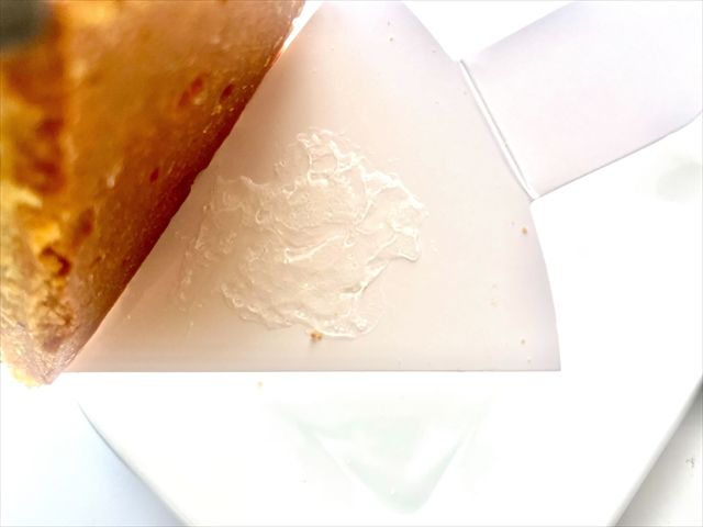タルトと台紙の間には接着剤のようなものが。実はこれ、水飴と砂糖でできているんです。台紙とタルトが密着しているので、崩れる心配がありません。