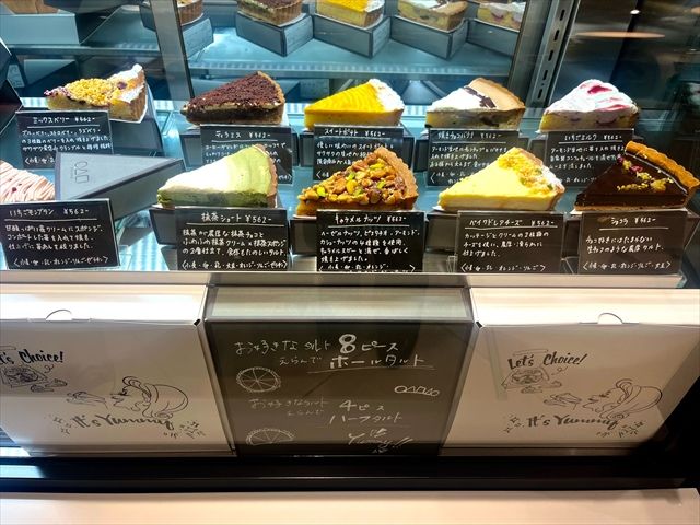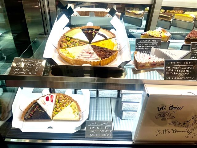 自分で好きなタルトを選んでホールにすることも可能です。4ピースのハーフホールタルトは2,246円(税込)、8ピースのホールタルトは4,493円(税込)となっています。ちなみにお店の人によると、ハーフホールタルトの間違いないラインナップは、ショコラ、ベイクドチーズ、キャラメルナッツ、いちごミルクだそうです。