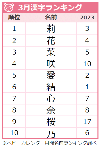 3月に生まれた女の子の名前の漢字ランキングTOP3は、1位「莉」、2位「花」、3位「菜」でした。春らしさを感じる漢字が上位にランクインし、名付けに多く用いられていました。