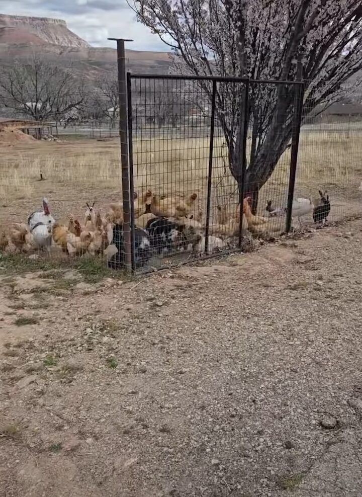 フェンスの前に集まるニワトリたち。 大集合しているのには、『ある理由』があったみたいです!!