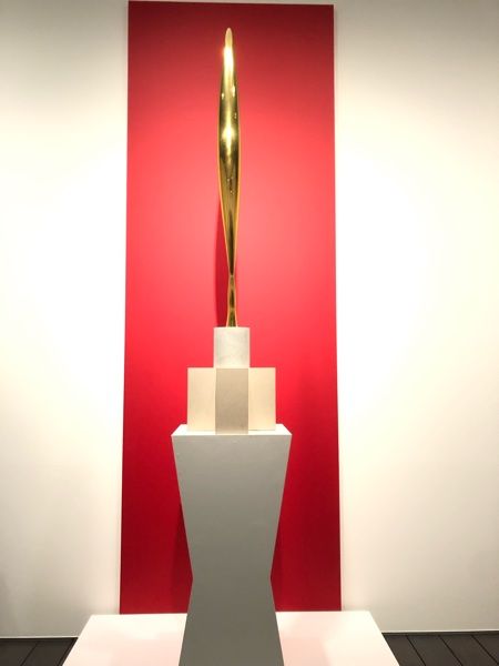 コンスタンティン・ブランクーシ《空間の鳥》1926年(1982年鋳造)、ブロンズ、大理石(円筒形台座)、石灰岩(十字形台座)、132.4×35.5×35.5cm、横浜美術館