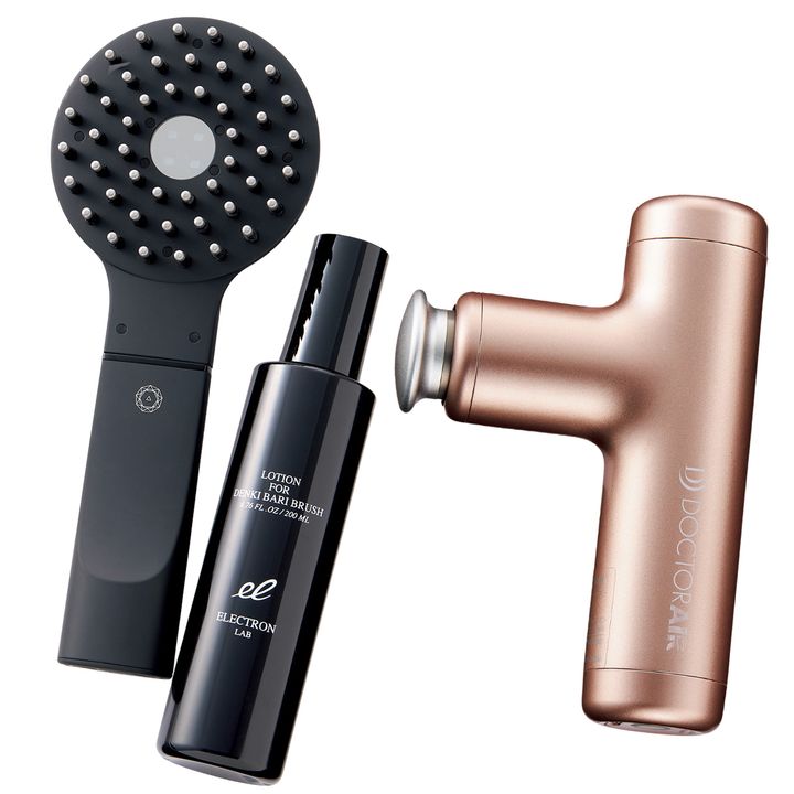 ボディ専用アタッチメントは広範囲に体にフィットし、コリをほぐします。デンキバリブラシ®2.0+ボディ¥217,800、デンキバリブラシローション ¥6,380 (エレクトロン)