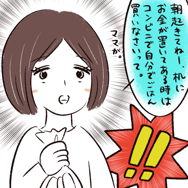 「朝起きてねー、机にお金が置いてある時はコンビニで自分でごはん買いなさいって。ママが」